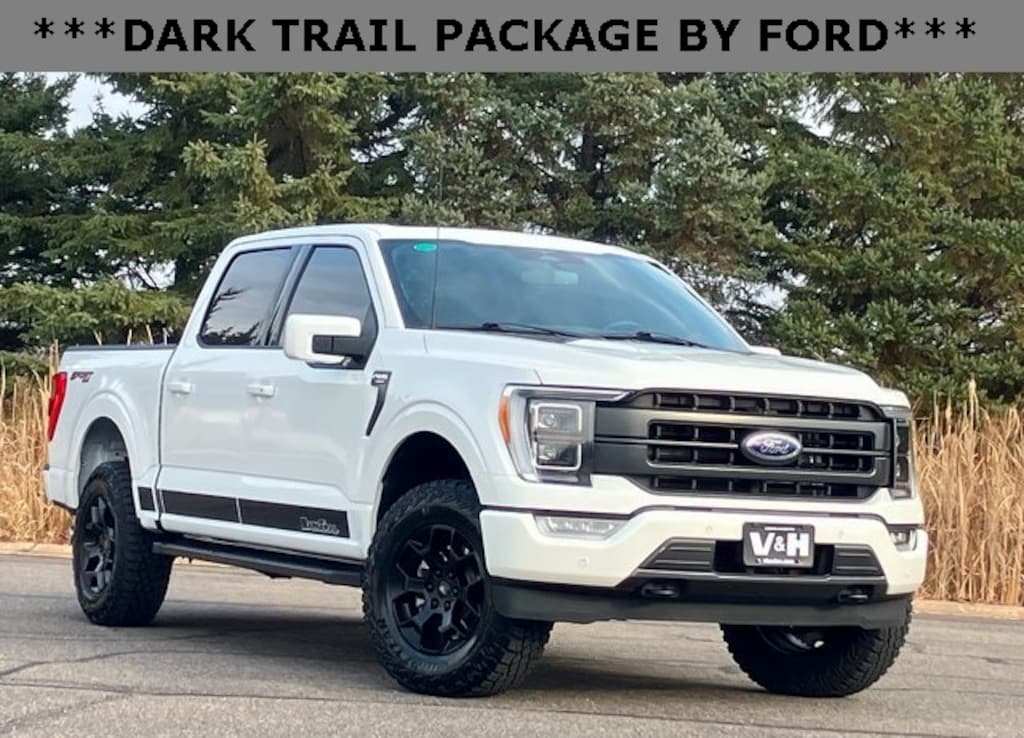 CARFAX One-Owner. Clean CARFAX. White 2023 Ford F-150 Lariat 4WD 10-Speed Automatic 3.5L V6 EcoBoost Dark Trail Package, F-150 Lariat, 4D SuperCrew, 3.5L V6 EcoBoost, 10-Speed Automatic, 4WD, White, Black Leather, 2nd Row Heated Seats, Accent-Color Angular Step Bars, Body-Color Front & Rear Bumpers, Box Side Decals, Chrome Single-Tip Exhaust, Class IV Trailer Hitch Receiver, Connected Built-In Navigation, Dark 2-Bar & 1 Minor Bar Style Grille, Equipment Group 502A High, Evasive Steering Assist, Ford Co-Pilot360 Assist 2.0, Integrated Trailer Brake Controller, Intelligent Adaptive Cruise Control w/Stop & Go, Intersection Assist, Lariat Sport Appearance Package, LED Projector w/Dynamic Bending Headlamps, Navigation system: Connected Navigation, Power Tilt/Telescoping Steering Column w/Memory, Pro Trailer Backup Assist & Pro Trailer Hitch Assist, Rain-Sensing Wipers, Speed Sign Recognition, Trailer Tow Package, Twin Panel Moonroof, Wireless Charging Pad.